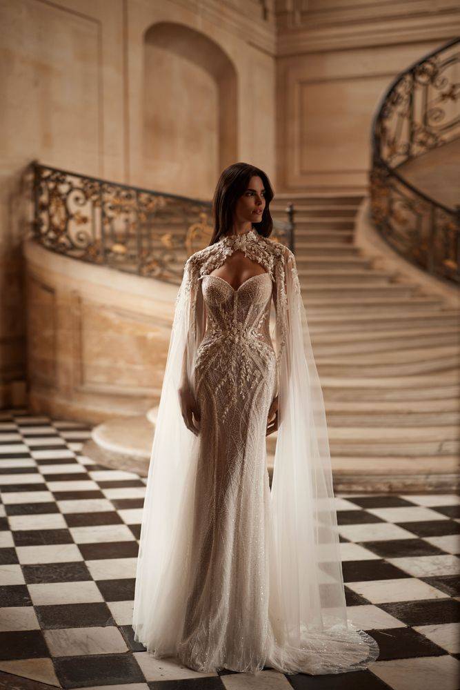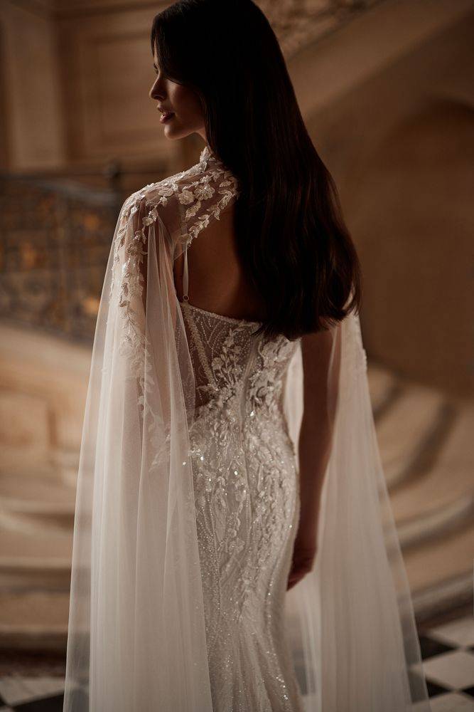 Pour sa dentelle semi-transparente pailletée, son décolleté cœur structuré, ses manches amovibles et sa cape florale : un modèle audacieux et couture.